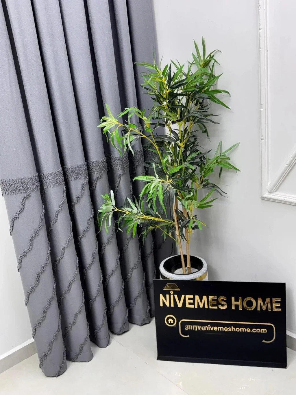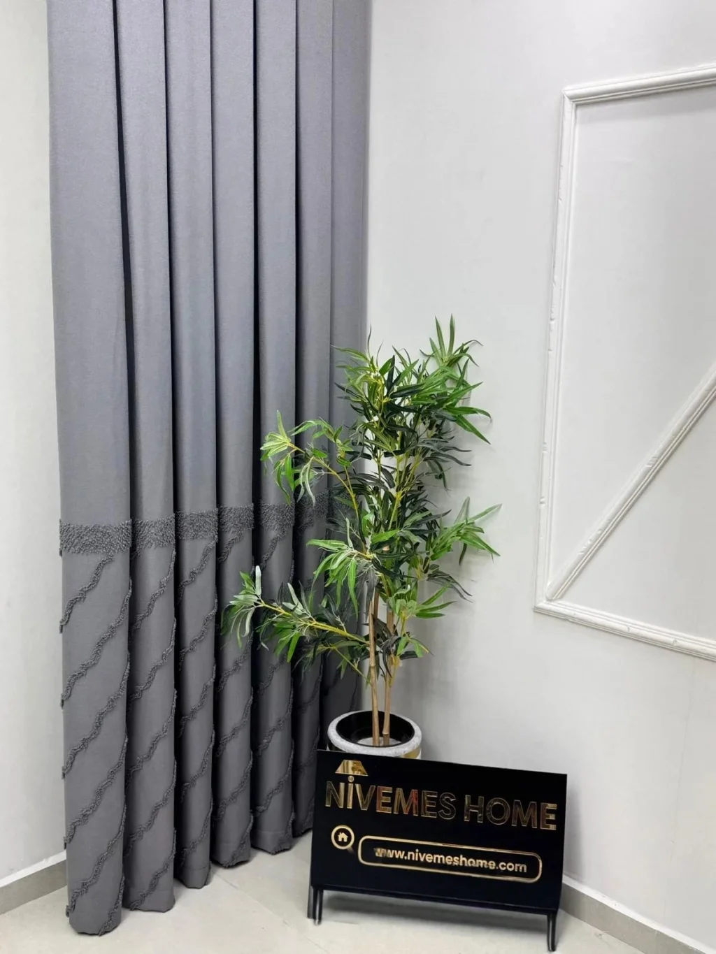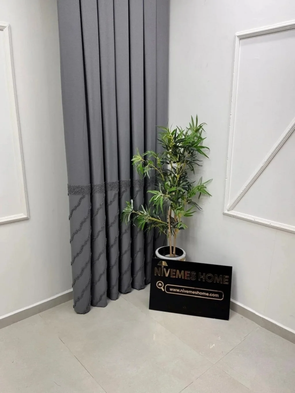التفاصيل الخاصة ذات الملمس والشكل الموجي في الجزء السفلي تضيف حركة إلى السطح البسيط مما يخرج الستارة من الرتابة.