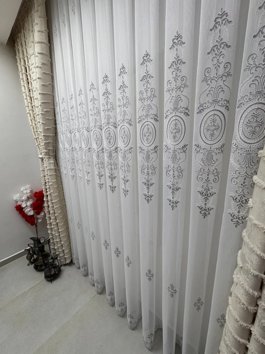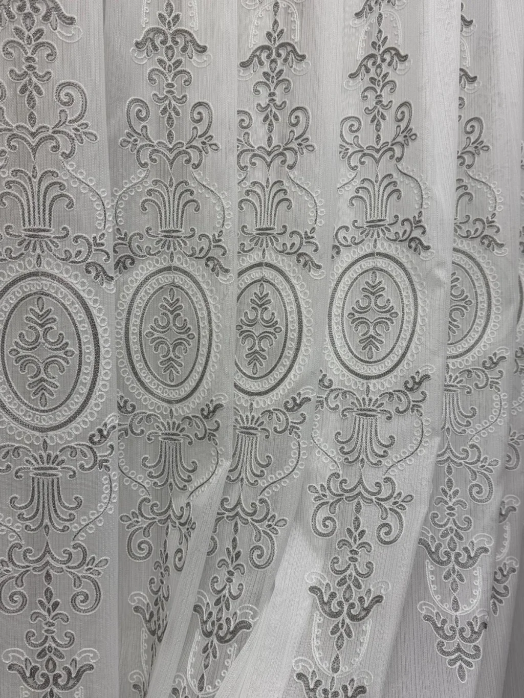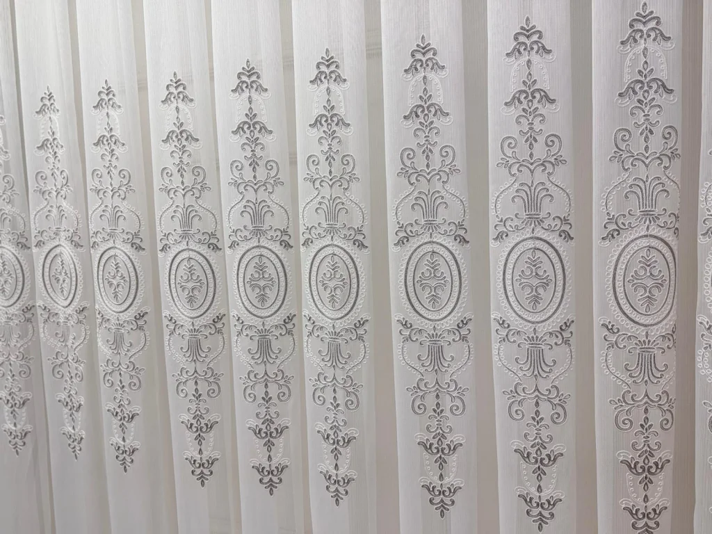 a special design where classic motifs meet delicate lace texture, bringing a profound elegance to spaces. Detailed embroideries extending along vertical lines give the curtain both depth and a magnificent stance. It softly filters the light, illuminating the environment without overwhelming it; with patterns becoming more pronounced in daylight and providing a sophisticated silhouette in the evening hours.