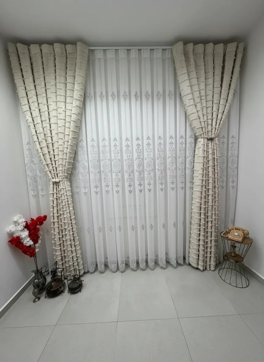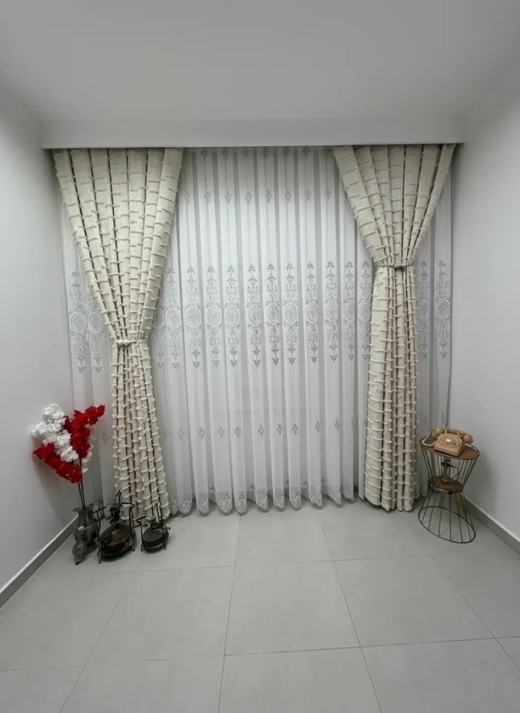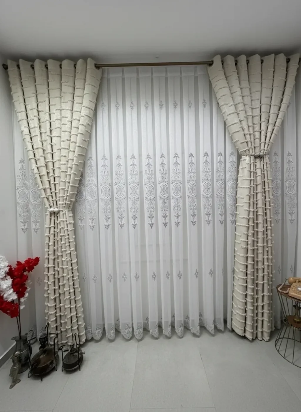 a special design where classic motifs meet delicate lace texture, bringing a profound elegance to spaces. Detailed embroideries extending along vertical lines give the curtain both depth and a magnificent stance. It softly filters the light, illuminating the environment without overwhelming it; with patterns becoming more pronounced in daylight and providing a sophisticated silhouette in the evening hours.