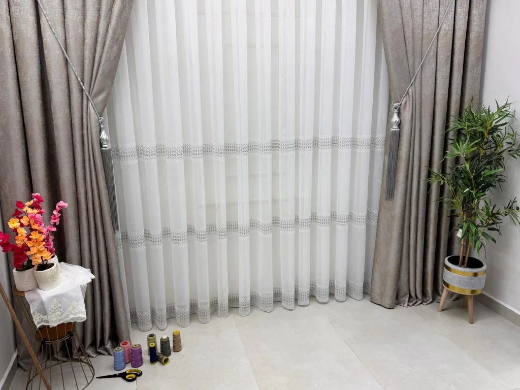 MELODİ V-GRİ cortina de bambú tul, con sus bordados geométricos modernos y su ligera textura, se adapta a cualquier decoración.