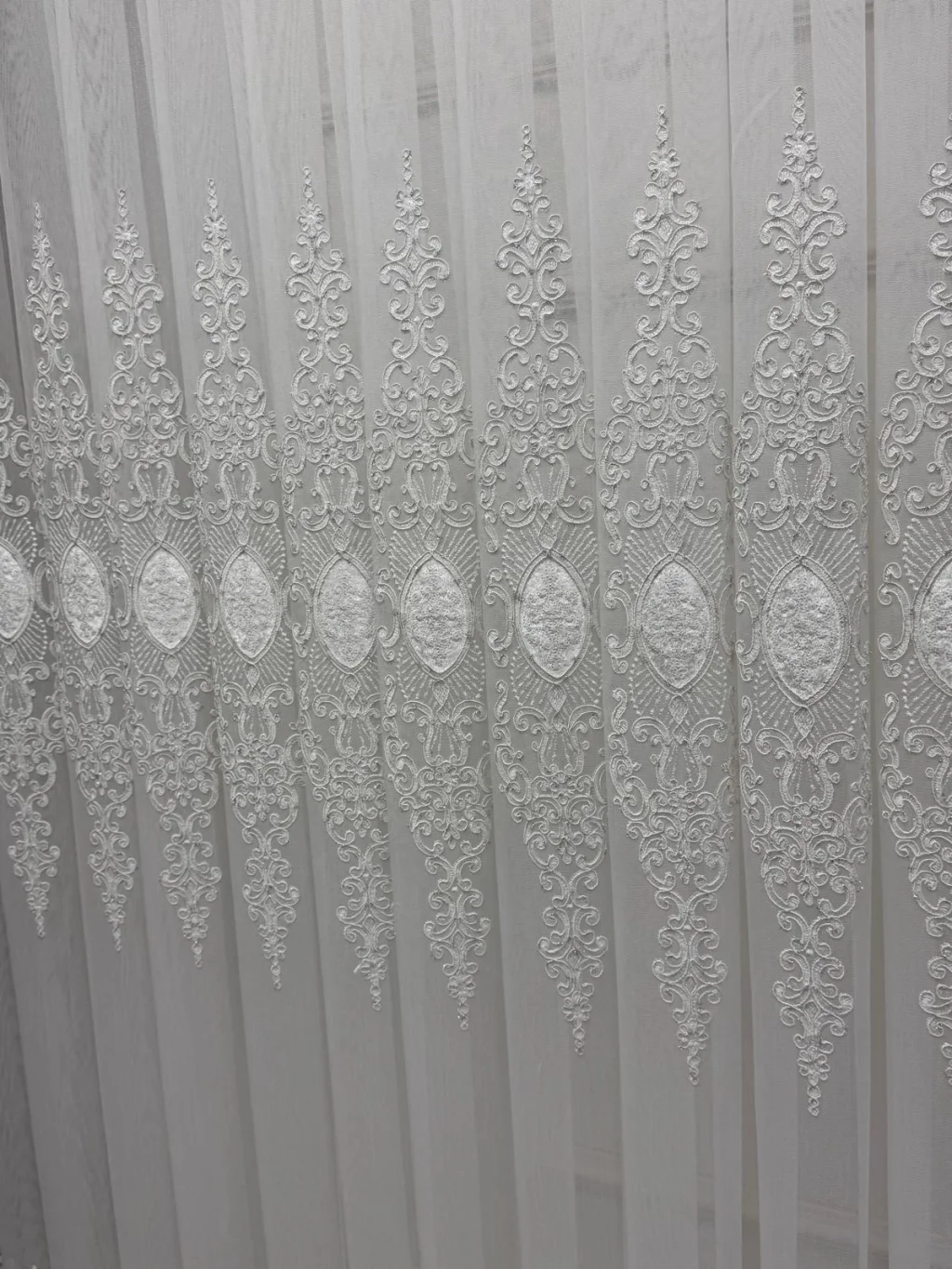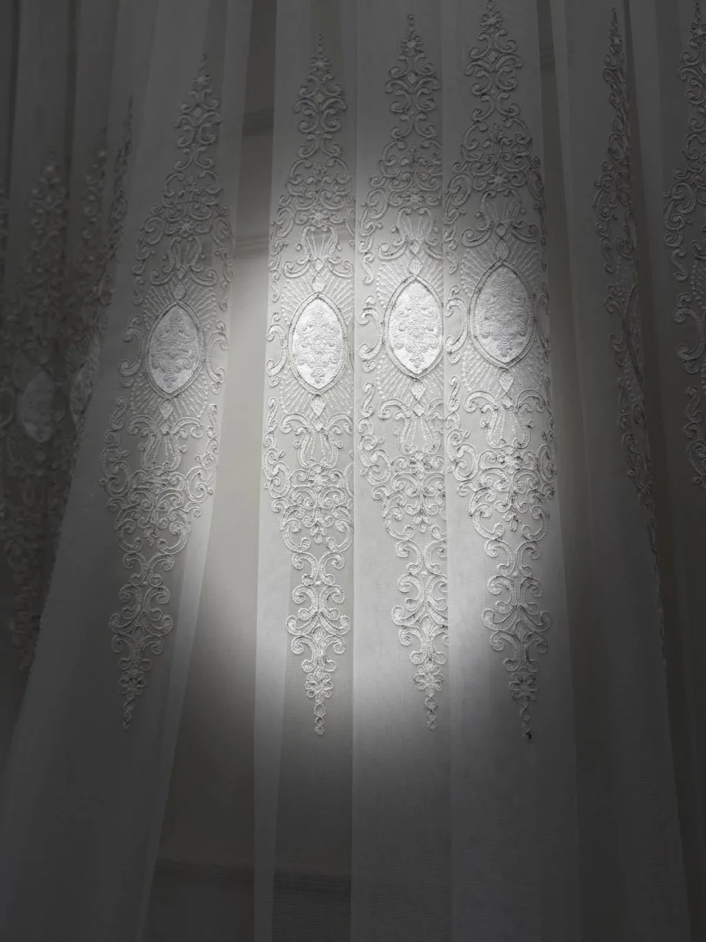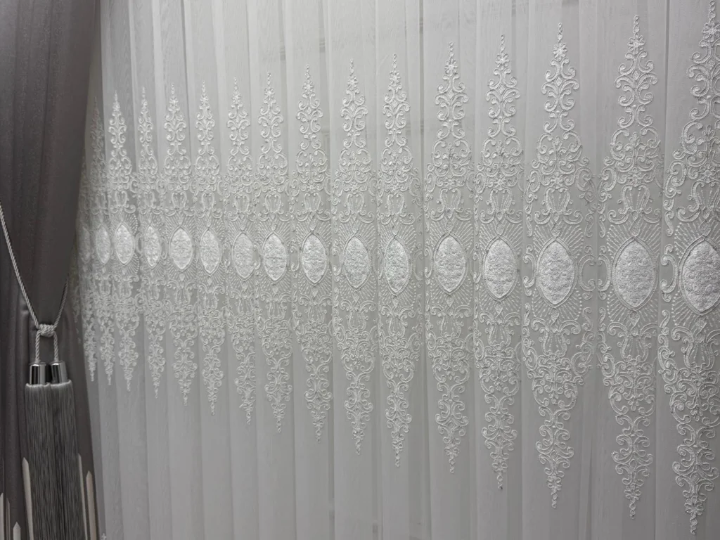 Con sus simétricos y elaborados diseños que se elevan en su fino tejido, toca su ventana como si fuera una obra de arte. Filtra la luz del sol suavemente, protege la privacidad y otorga a la habitación una atmósfera fresca y noble.