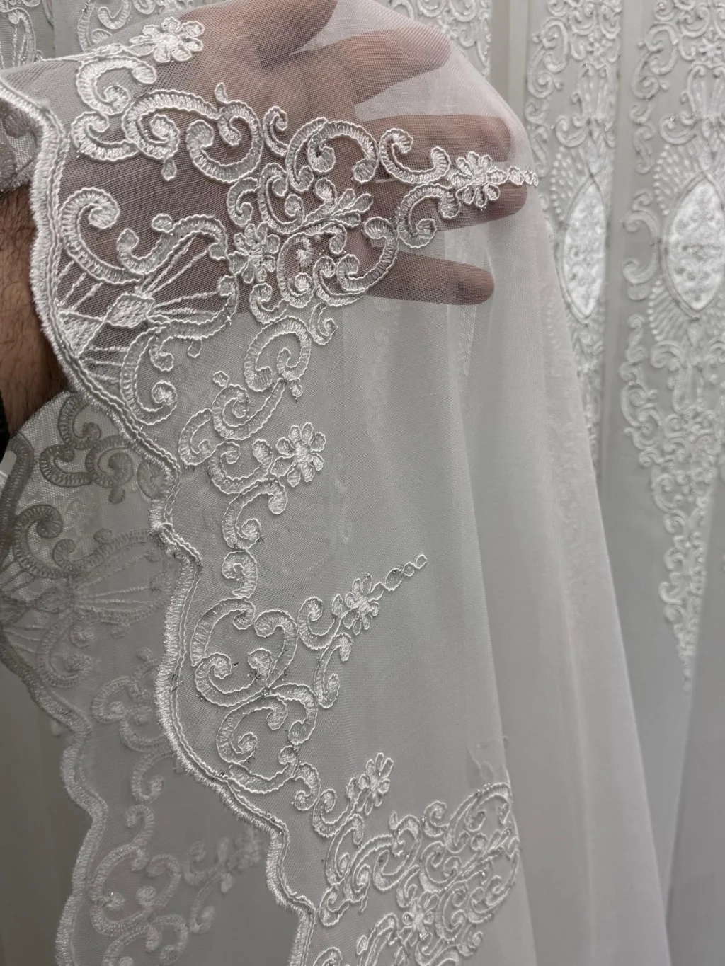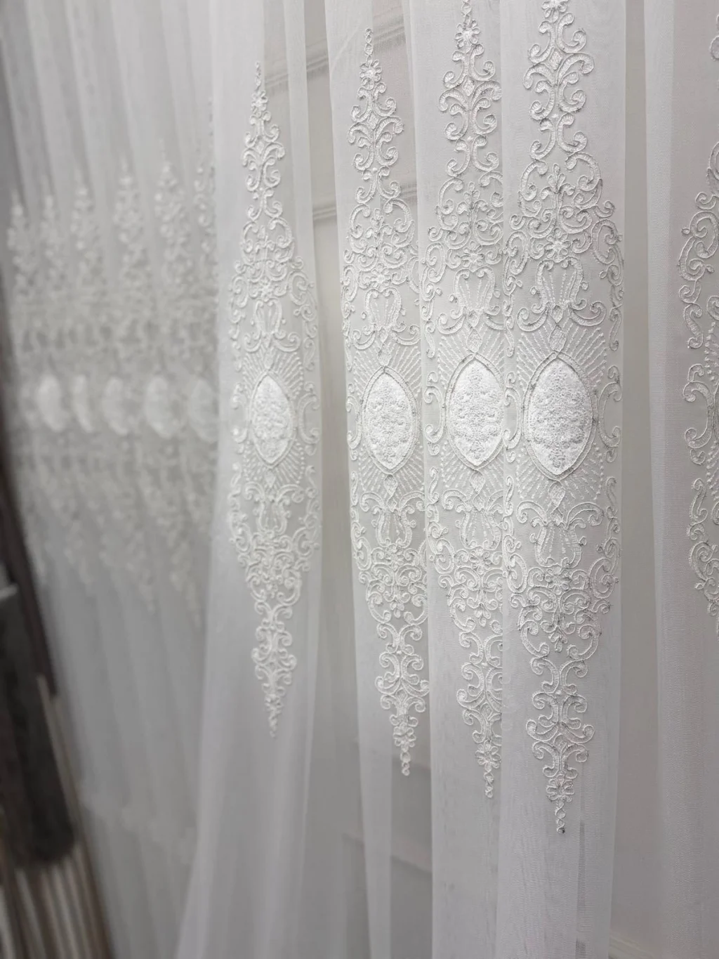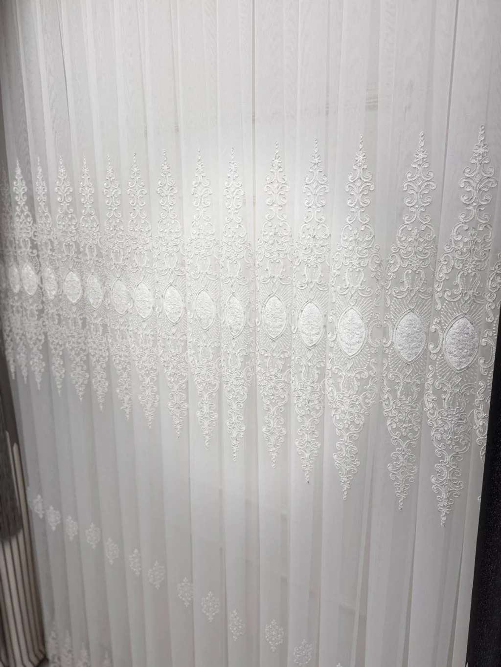 Con sus simétricos y elaborados diseños que se elevan en su fino tejido, toca su ventana como si fuera una obra de arte. Filtra la luz del sol suavemente, protege la privacidad y otorga a la habitación una atmósfera fresca y noble.