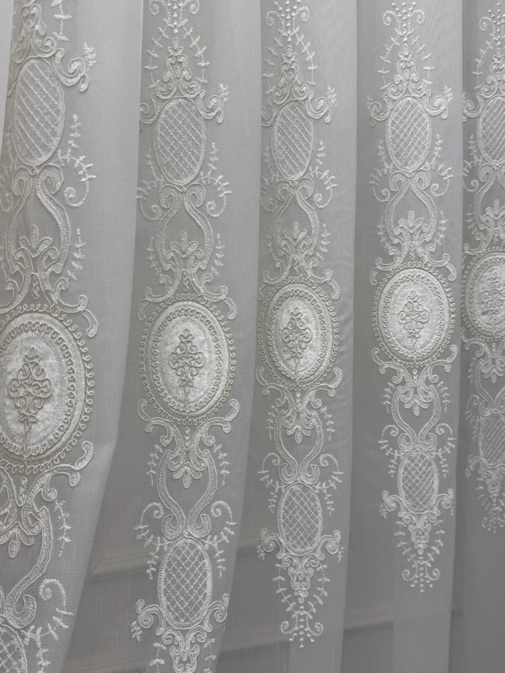 Hazel, es un diseño especial donde se encuentran los motivos clásicos con la tela de tul delicada, otorgando al espacio una elegancia arraigada. Los bordados detallados a lo largo de líneas verticales aportan tanto profundidad como una postura majestuosa a la cortina. Filtra la luz suavemente iluminando el ambiente sin sofocarlo; bajo la luz del día, sus patrones son más definidos, mientras que en las horas de la tarde ofrece una silueta sofisticada.
