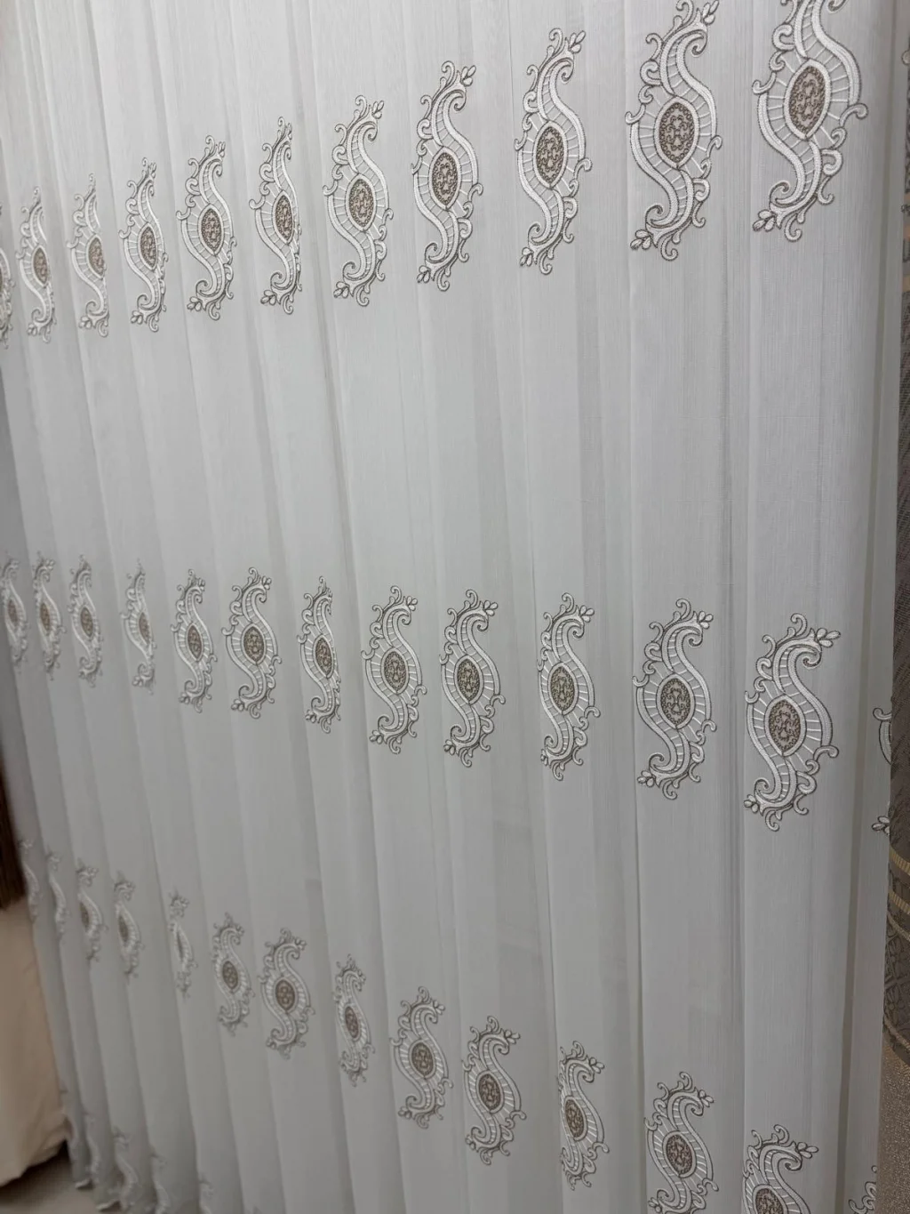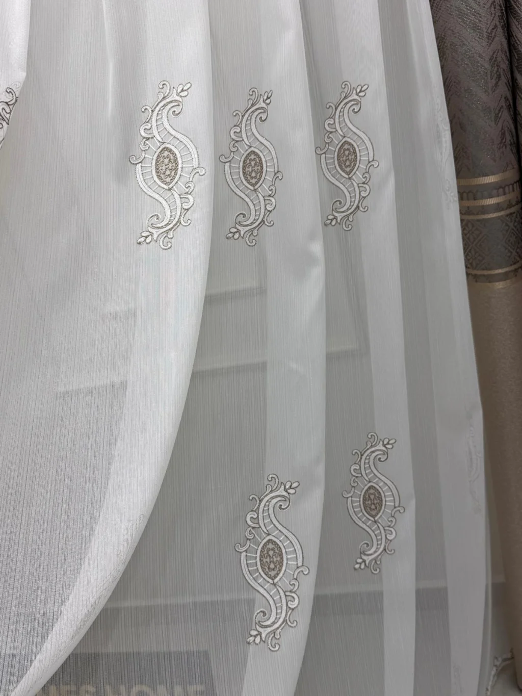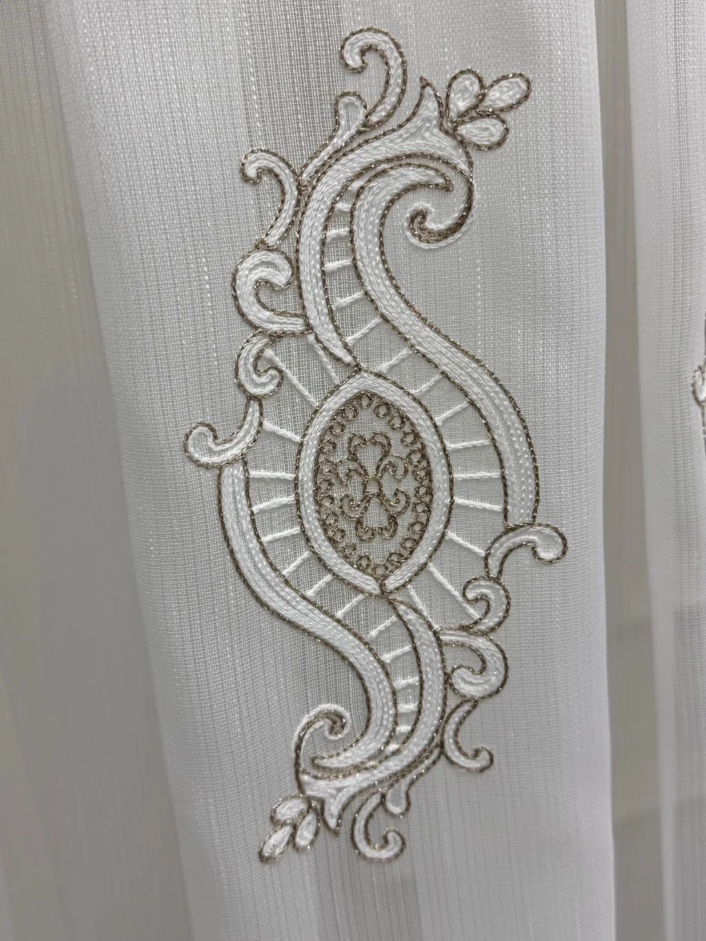 La Cortina Royal de Tül aporta una elegancia distinguida a tus espacios vitales con sus detalles de bordado elegantes y su porte noble. Gracias a su tejido de tül fino y de alta calidad, permite que la luz del día entre suavemente creando un ambiente fresco. Sus motivos meticulosamente trabajados son la combinación perfecta para decoraciones clásicas y modernas. Es una opción ideal para el salón, la sala de estar y los dormitorios.