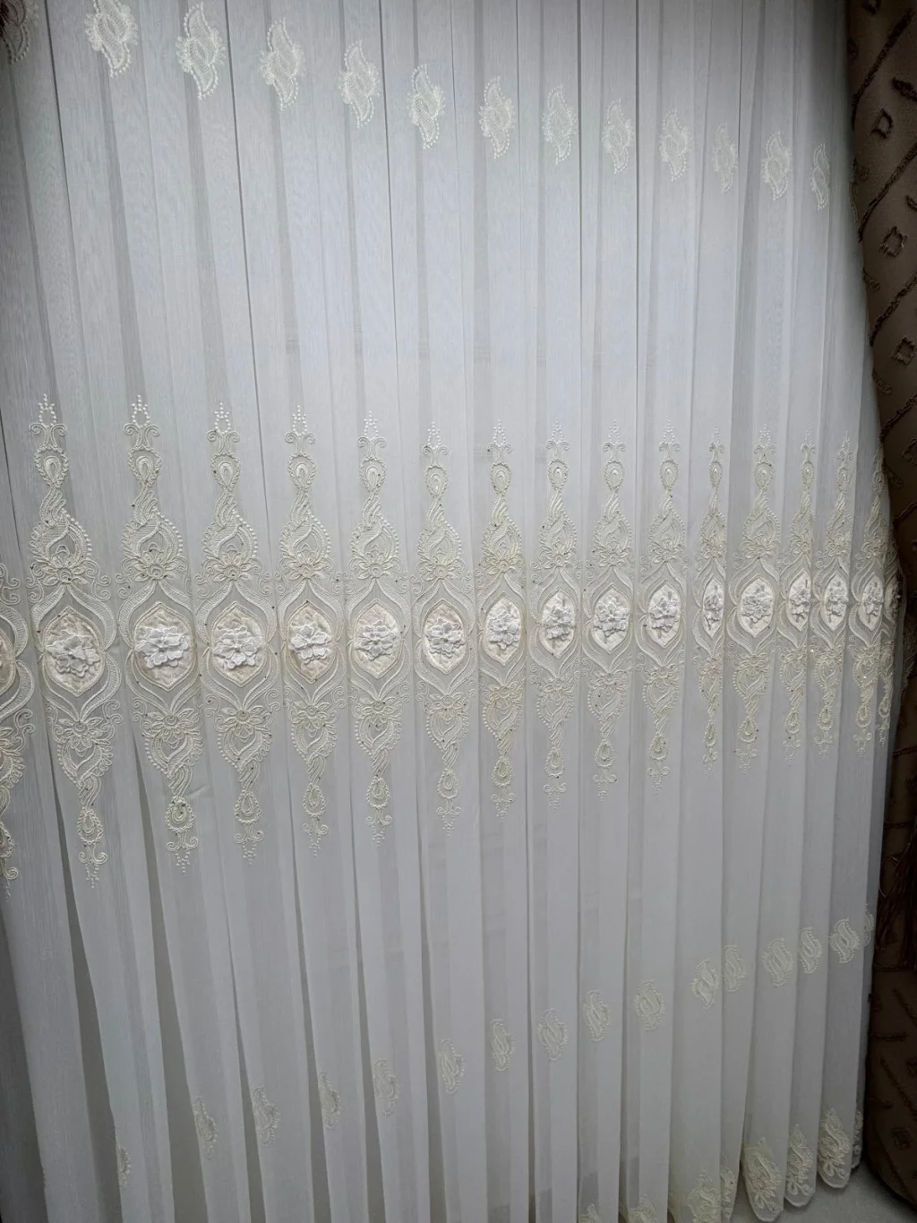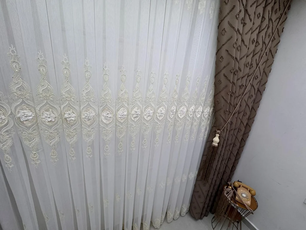 Cansel Gold Tenda di Tulle, che porterà un'eleganza senza tempo nella tua casa, dona un'atmosfera nobile alle case con la sua trama dorata e dettagli di perle. La nostra tenda di tulle, che offre un brillante splendore grazie ai suoi ricami eleganti, presenta una trama speciale che brilla in tenui tonalità d'oro a seconda dell'angolo della luce, combinando lusso ed estetica. NİVEMESHOME prodotto originale