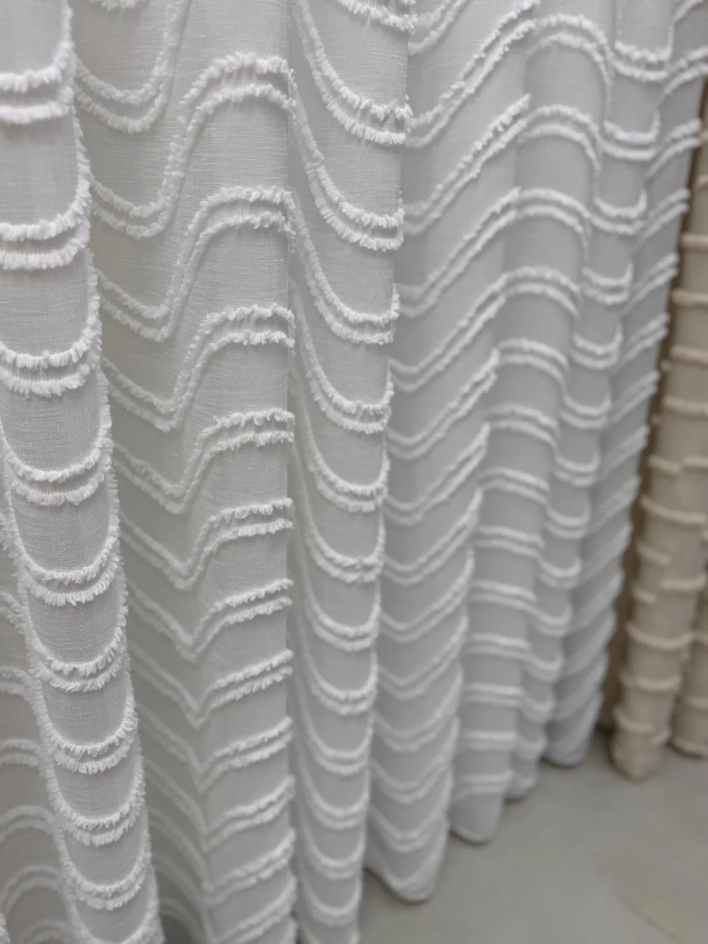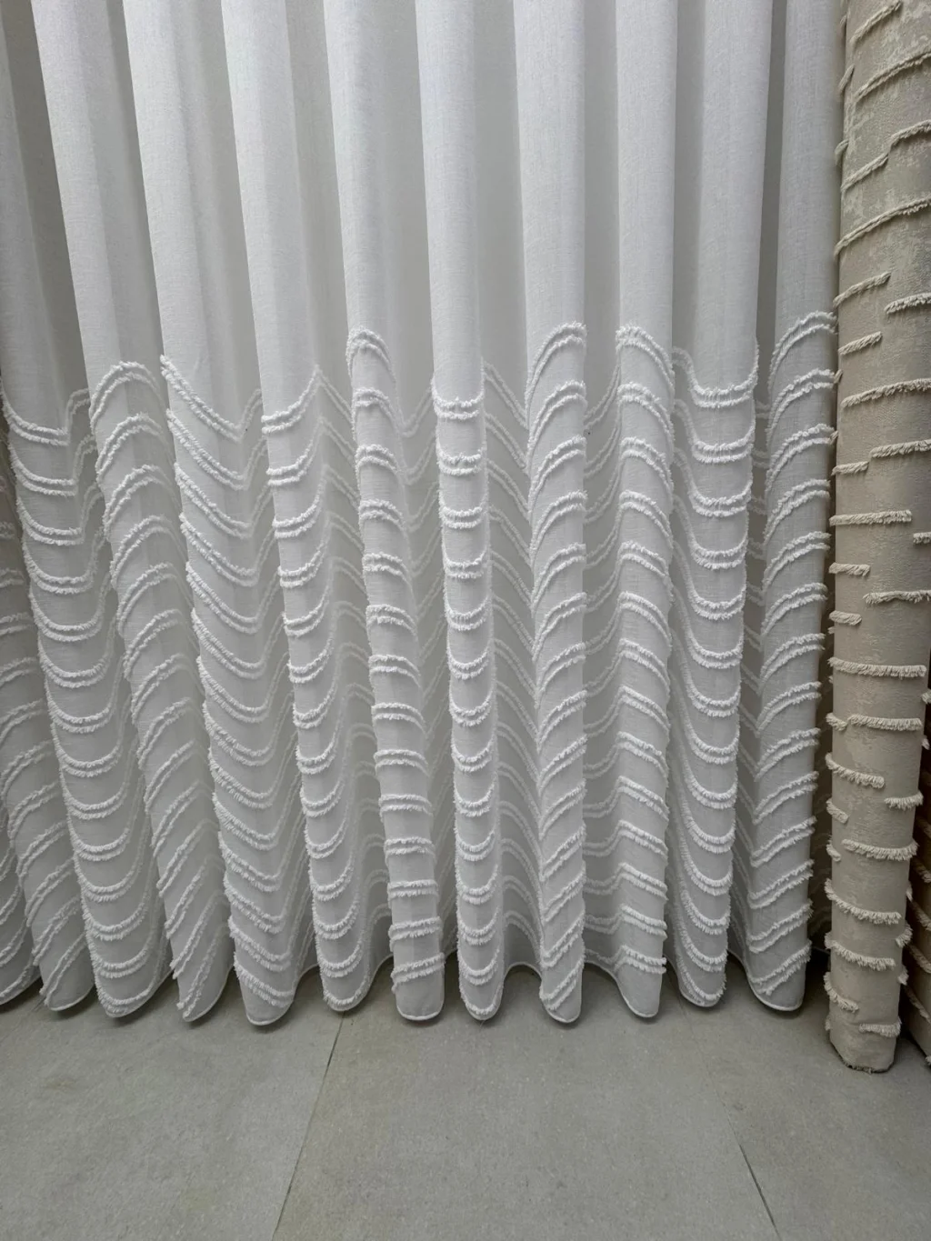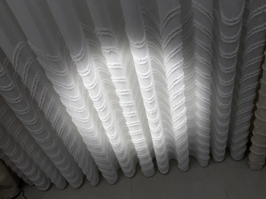 Тюльный занавес, оформленный современными волновыми узорами, добавит элегантности и свежести в ваше жилое пространство. Благодаря своей светопроницаемой структуре он идеально подходит для использования в гостиной, спальне и на балконе, лаская утренний свет своей декоративной привлекательностью.